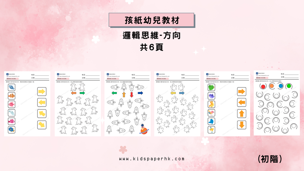 這是專為幼兒設計的邏輯思維練習冊,主題聚焦「方向辨識與箭頭追蹤」,共計6頁,採用全彩可愛動物與箭頭指示圖案,屬初階篇,適合香港家長或幼稚園教師用以訓練兒童的空間方向感、視覺追蹤能力、注意力集中以及簡單邏輯判斷與手眼協調。