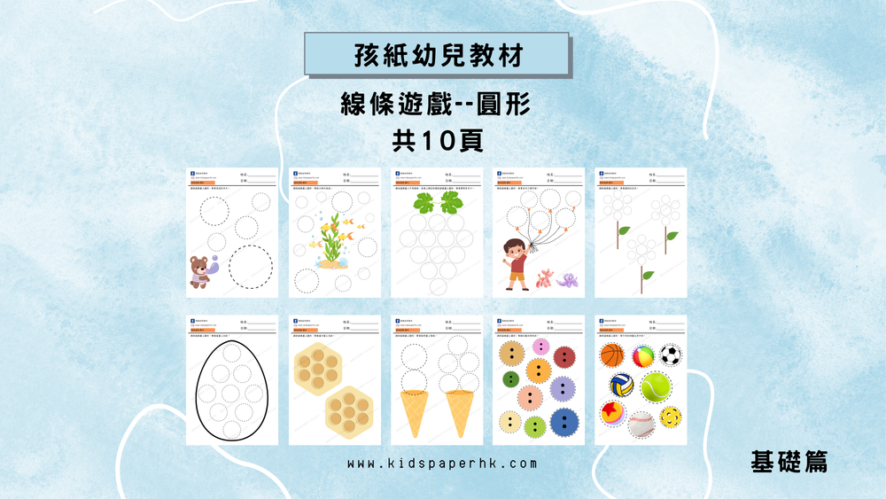 這是專為幼兒設計的描線練習冊,主題聚焦「線條遊戲-圓形」,共計10頁,採用全彩可愛卡通圖案搭配圓形/弧形虛線引導,屬基礎篇,適合香港家長或幼稚園教師用以訓練兒童的手部靈活性、握筆控制、弧線軌跡掌握以及手眼協調能力。