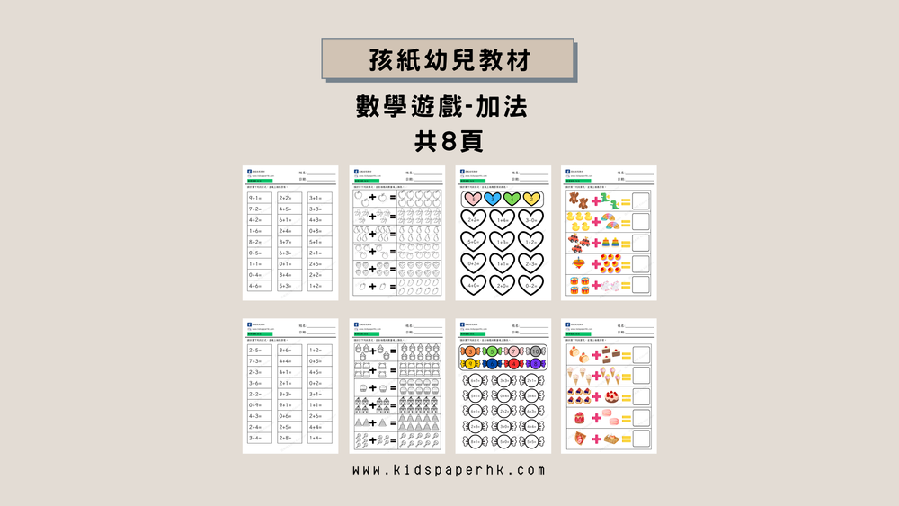 這是專為幼兒設計的加法基礎練習冊,主題聚焦「數學遊戲-加法」,共計8頁,採用全彩可愛圖形與實物數量對應形式,屬基礎至中階篇,適合香港家長或幼稚園教師用以訓練兒童的計數能力、加法概念建立、數量對應以及簡單算式書寫基礎。
