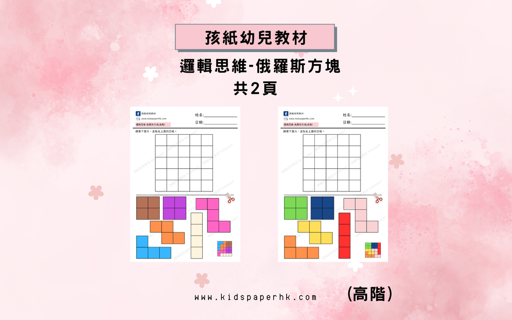 這是邏輯思維練習冊,主題聚焦「邏輯思維-俄羅斯方塊(高階)」,屬於剪貼拼圖遊戲,共2頁,採用彩色方塊圖案與格子模板,適合香港家長或幼稚園教師用以訓練兒童的空間想像力、圖形旋轉能力、問題解決技巧以及手眼協調與精細動作技能。