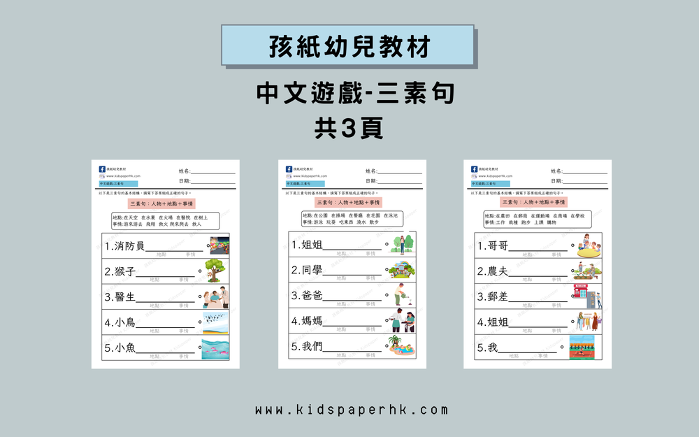 適合幼稚園K2–K3階段,或小一前語言與書寫準備。專注於「三素句」結構(主語:人物 + 狀語:地點 + 謂語:事情),是從二素句進階到更完整句子的關鍵步驟。幫助兒童理解句子需包含「誰、在哪裏、做什麼」,避免日後造句時出現缺元素、詞序混亂或語意不完整等問題。