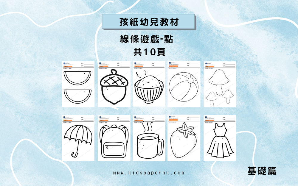 這是專為幼兒設計的基礎描線練習冊,主題聚焦「線條遊戲-點」(點點描繪或沿點上色練習),共計10頁,採用簡潔黑白線稿風格(輪廓圖+點點標記),適合香港家長或幼稚園教師用以訓練兒童的精細動作技能(fine motor skills)、手眼協調能力以及握筆基礎。