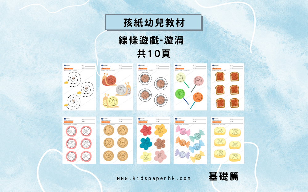 這是專為孩子設計的基礎描線練習冊,主題聚焦「漩渦/螺旋線條遊戲」,共計10頁,採用可愛卡通風格,適合香港家長或幼稚園教師用以訓練兒童的精細動作技能(fine motor skills)、手眼協調能力以及握筆基礎。此類練習為幼兒運筆入門之必備項目,因為漩渦線條可由內向外或由外向內旋轉,有效鍛鍊手指靈活性、力度控制,避免日後書寫時出現歪斜、過重或過輕等問題。
